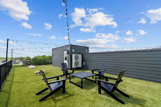 One of the most unique parts of this property is the rooftop deck, complete with bistro lights, so the lack of sun doesn’t stop you from having fun. Corhole boards, ring toss, and four Adirondack chairs all wait for you on this spacious patio covered in textured grass, so even if you're taking a day off from the beach, we think you’ll find yourself on this level most of the time, enjoying the views and taking in the salty sea air—we know we would!